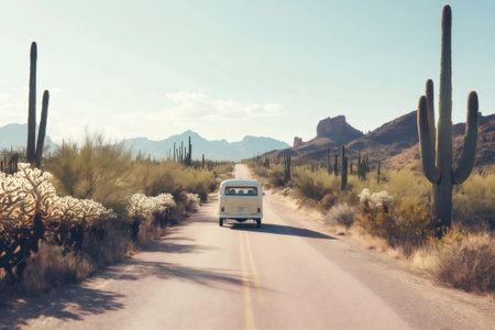 Classic van driving on a scenic desert road surrounded by cacti and mountains in Arizona, offering a picturesque view of the arid landscape