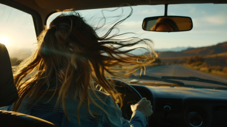 woman driving with the windows down, hair blowing, and music playing, generative ai