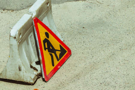 triangular road sign roadwork on asphalt