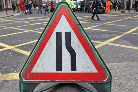 Road Narrows Traffic Sign at City Street Intersection
