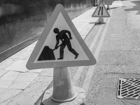 Road works sign for construction works in progress in black and white