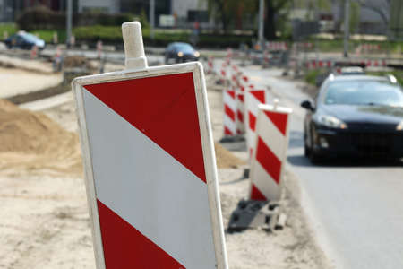 Warning bollards at the construction of a new road in the city.