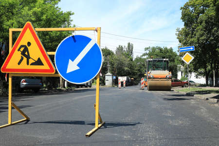 Road signs. Road works. Replacement of the road surface.