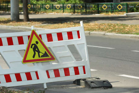 Barricade with road construction sign on city street. Repair works