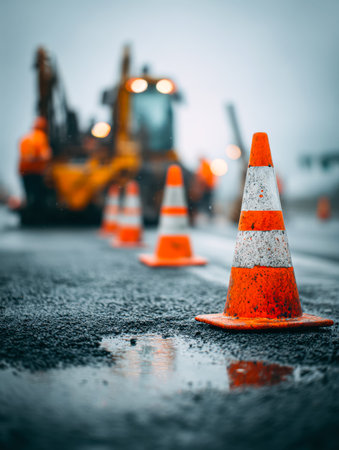 Industrial road under construction, construction signs, machinery, dusty air, gritty atmosphere
