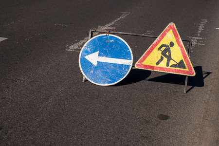 Road works sign on the road. Repair work of road signs and a bypass arrow on a background of blue sky.