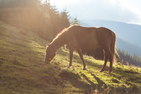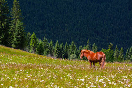 A mare grazing on the pasture, Carpathian mountains, Ukraine
