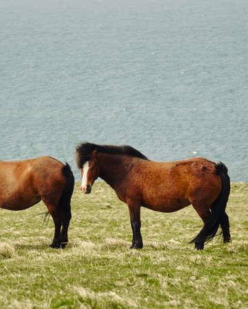 Icelandic Wild brown horses in country side, field