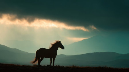 A horse stands silhouetted against a vivid sky filled with dark clouds and golden light. The scene captures the beauty of nature at dusk in a tranquil landscape.