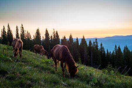 Horses grazing in a meadow in the mountains at sunset.