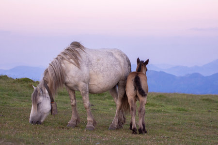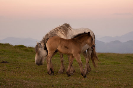 mother and child horses on a peaceful mountain landscap