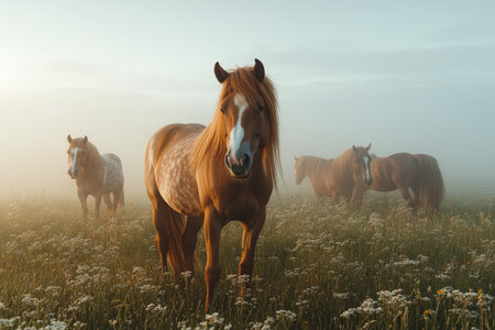 Horses in foggy sunrise meadow