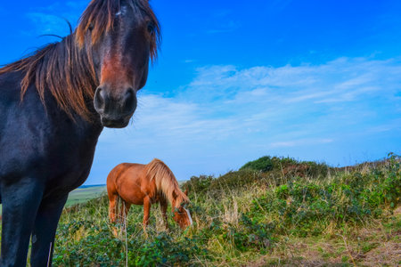 Two brown horses grazing peacefully on a lush green hillside, relishing the tranquility of nature and embodying a serene pastoral scene filled with harmony and beauty