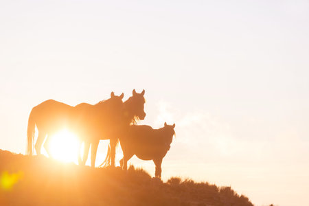 Three wild Kaimanawa horses standing on the top of mountain ranges in the early morning sunlight