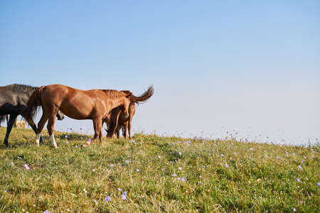 A group of wild horses standing on a beautiful meadow, their manes blowing in the wind as they bask in the sunlight