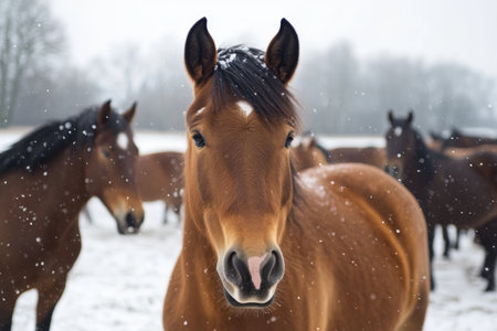 A herd of horses navigates through a beautiful winter landscape, with snowflakes gently falling all around. The horses move gracefully across the snow-covered ground, embodying the spirit of winter.
