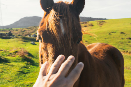 A closeup of a hand stroking a beautiful red horse in wild nature