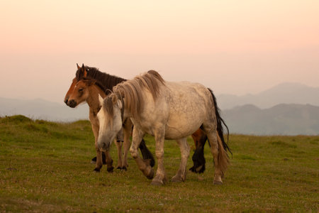 Horses grazing in a meadow in the mountains at sunset.