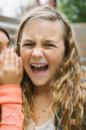 Girl whispering to friend with blonde hair
