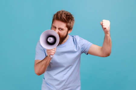 Portrait of aggressive bearded man holding megaphone near mouth, loudly speaking, screaming, making announcement with raised arm, protesting. Indoor studio shot isolated on blue background.