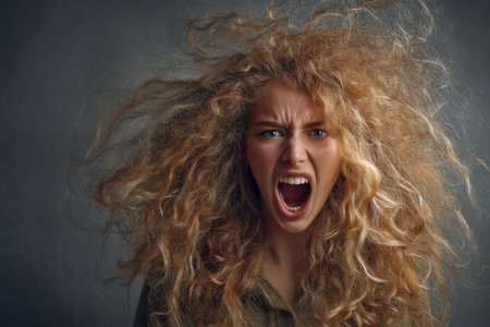 Portrait of a distressed woman with wild hair, expressing pain against a gray background