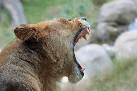 Lioness yawning, Female lion yawning