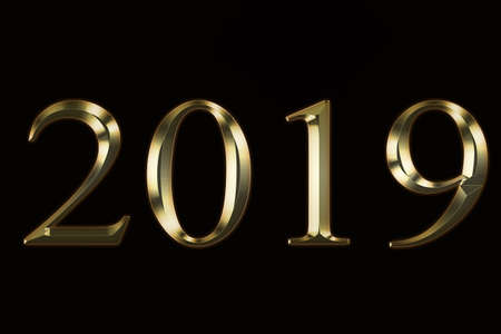 Numeral 2019, isolated on black background, 3d render . Gold number 2019 stock photo . Gold sparkling Numbers Design of greeting card of Happy new year design. Gold Shining Pattern.