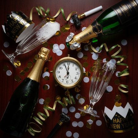 New Year's Eve. Champagne, clock, glasses and confetti on a wooden background.