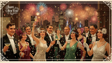 Costume party, 1920s 30s: Flapper dresses, fedoras, and gangster suits, friends dancing the Charleston and sipping cocktails.