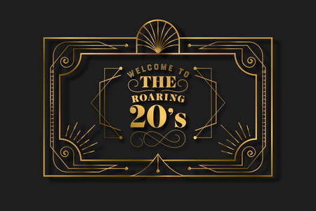The roaring 20s abstract background frame in vintage art deco style. Gold and black retro design with traditional geometric line decoration, text quote, ornate border.
