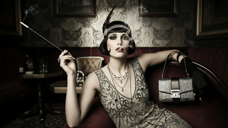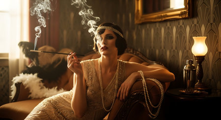 Elegant 1920s Flapper Woman Relaxing in Vintage Lounge