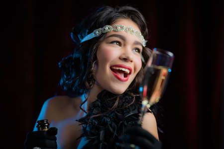 Retro styled woman dressed in Flappers dress raises glass of champagne like toast, drinking wine on velours background. Roaring twenties, retro, party, fashion concept