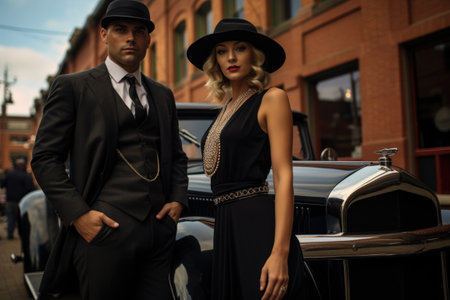 Young gangster couple is posing near a vintage car, the man is holding a gun