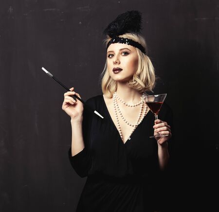 Beautiful blonde woman in twenties years clothes with smoking pipe and cocktail on dark background