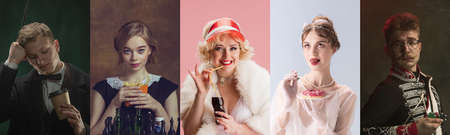 Close-up portraits of medieval people as a royalty persons in vintage clothing on dark background. Concept of comparison of eras, modernity and renaissance, baroque style.