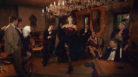 Retro friends gathered around dancer performing in vintage bar under crystal chandelier