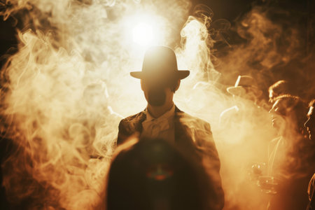 A well dressed mafia boss sits in an elegant room exuding confidence. Smoke curls from a cigarette in his mouth as he gazes intently embodying the essence of organized crime.