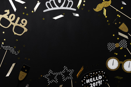 Table top view of Merry Christmas decorations & Happy new year 2019 ornaments concept.Flat lay essential difference objects to party season the photo booth prob on modern wooden black background.