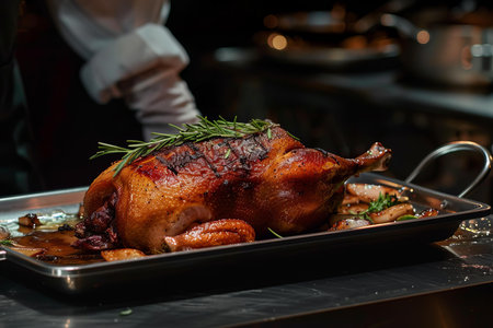 Chef presenting perfectly cooked roasted duck garnished with rosemary