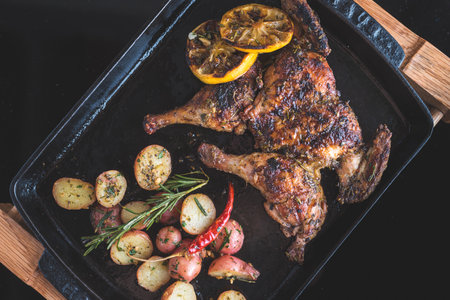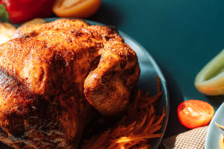 Freshly grilled chicken on blue plate with potatoes and tomatoes on blue background.