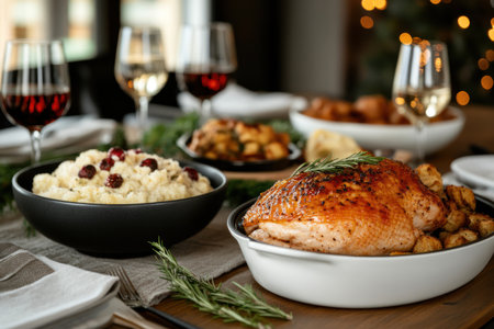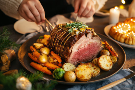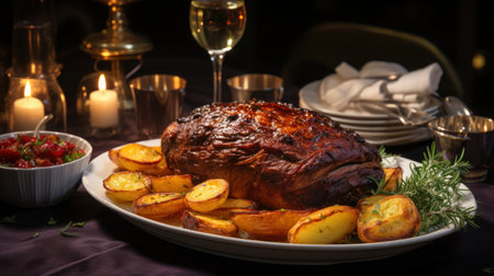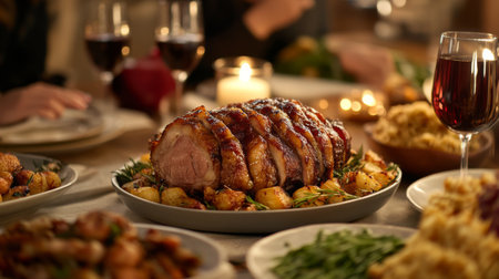 A beautifully arranged festive dinner featuring a succulent roast meat centerpiece, accompanied by wine, side dishes, and a cozy, elegant atmosphere.