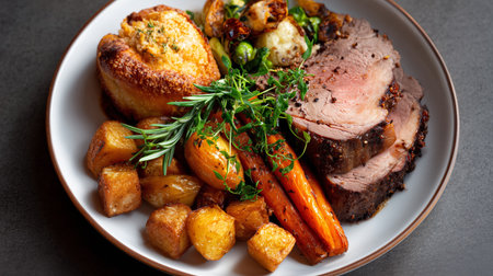Plated roast beef with a side of Yorkshire pudding and roasted vegetables