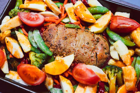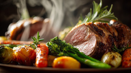 A beautiful display of succulent roasted meat paired with a variety of vibrant vegetables, showcasing gourmet culinary skills and inviting aromas.