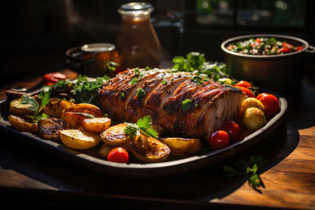 The typical Brazilian pork loin is a pork cut served at parties and barbecues in Salgado Brazil and accompanied by vegetables, generative IA