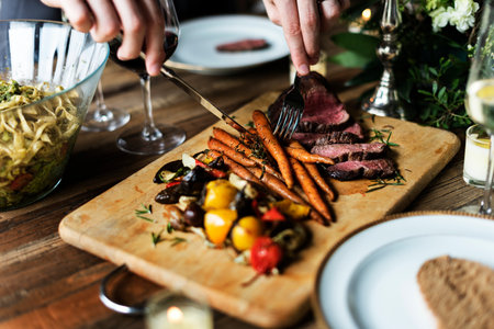Person cuts beef steak with grilled vegetables served on white plate