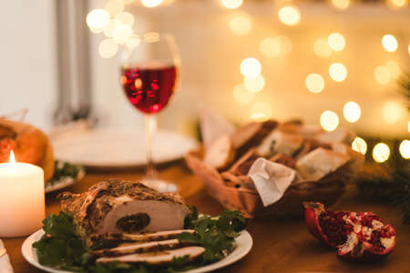 Festive New Year dinner. Traditional Christmas meat food concept