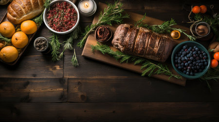 An AI generated illustration of a wooden surface complete with delicious food in the evening
