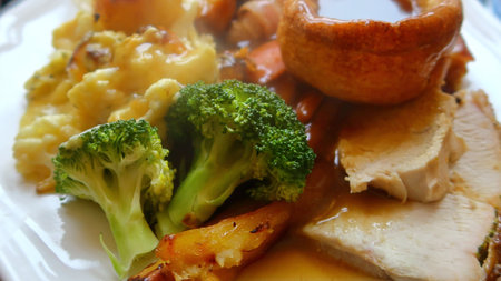 Roast potatoes and roast chicken breast in a chicken and white wine gravy with peas, carrots, pork and onion stuffing and a Yorkshire pudding, traditional english food