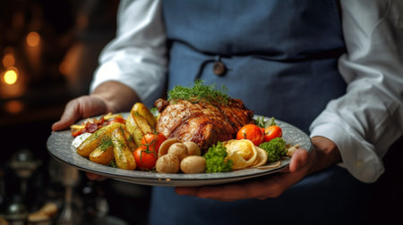 Close-up of senior woman holding dish with roasted chicken and vegetables