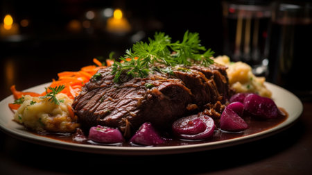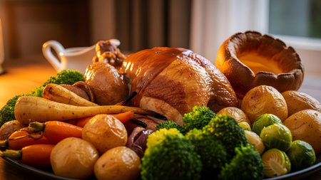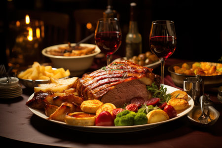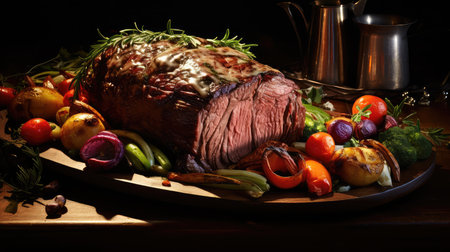 AI generated roast beef Sunday dinner with golden potatoes Yorkshire puddings and vegetables in cinematic shadows creating a warm inviting atmosphere with natural light and rich textures